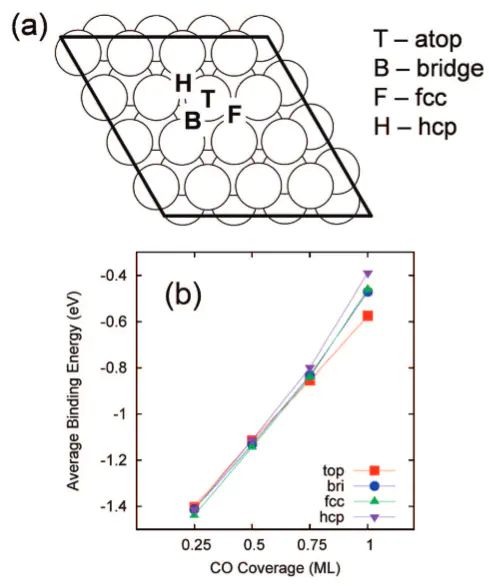 (top、bridge、fcc和hcp)的示意图,同时进一步绘制了平均CO吸附能随覆盖度(0.25 ML至1.0 ML)的变化曲线,显示吸附能从约-1.4 eV降至-0.5 eV,体现了横向排斥作用的影响。