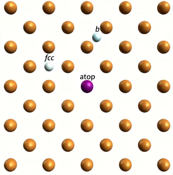 就是直接坐落在表面单个原子正上方,几何最直观;位于两个表面原子之间的连线上;通常位于三个或四个基元原子环中心,按晶格可分为fcc/hcp等不同的几何类型。下图展示了Cu(100)表面终止层的三种化学吸附位点示意图。