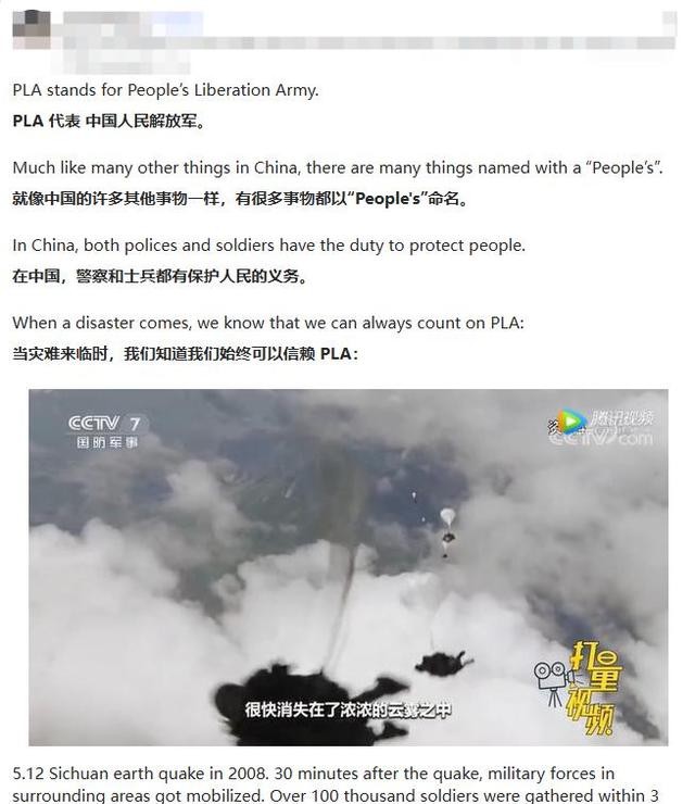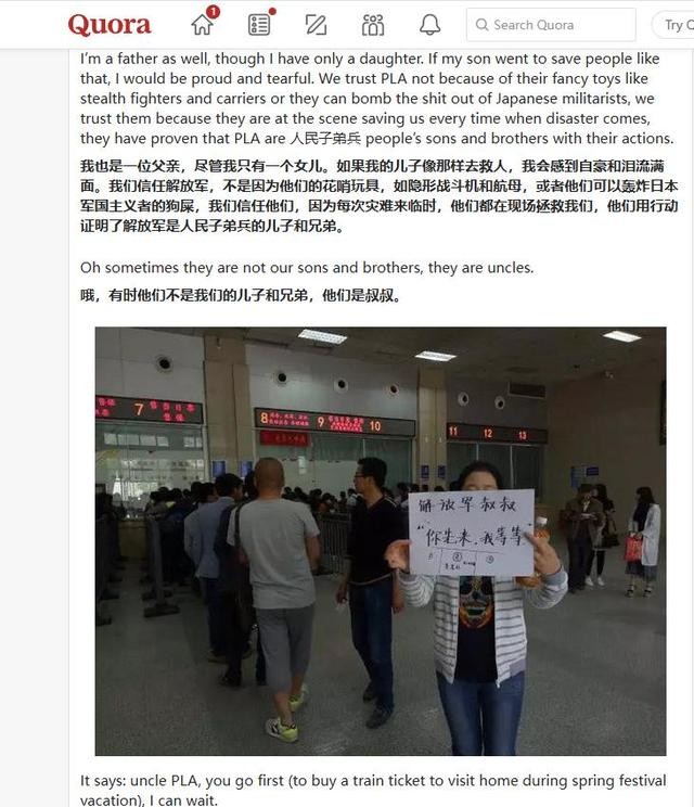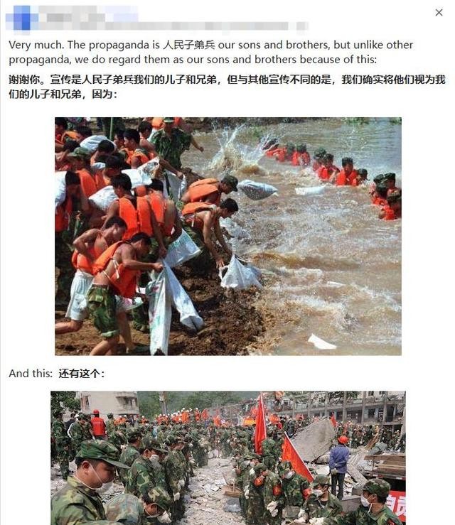 但是在中国人眼中的解放军,就是为我们解决问题的人,你甚至可以在大街上找一个穿着军装的人借钱,他都会毫不犹豫的借给你,在其他国家,这是不可能的。