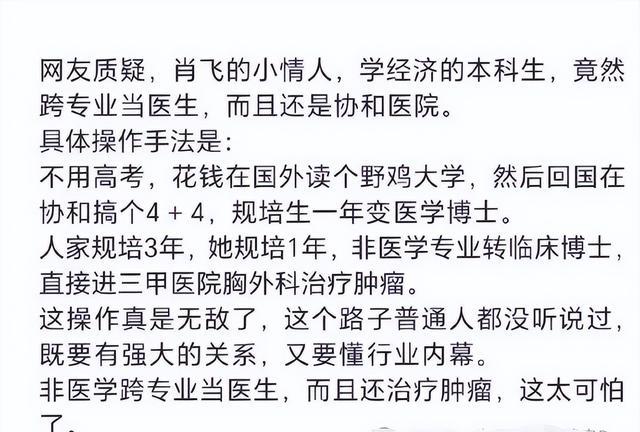 有网友爆料,肖飞的出轨对象或许并非仅有举报信提及的中日友好医院胸外科某护士长与中国医学科学院肿瘤医院某规培住院医师。
