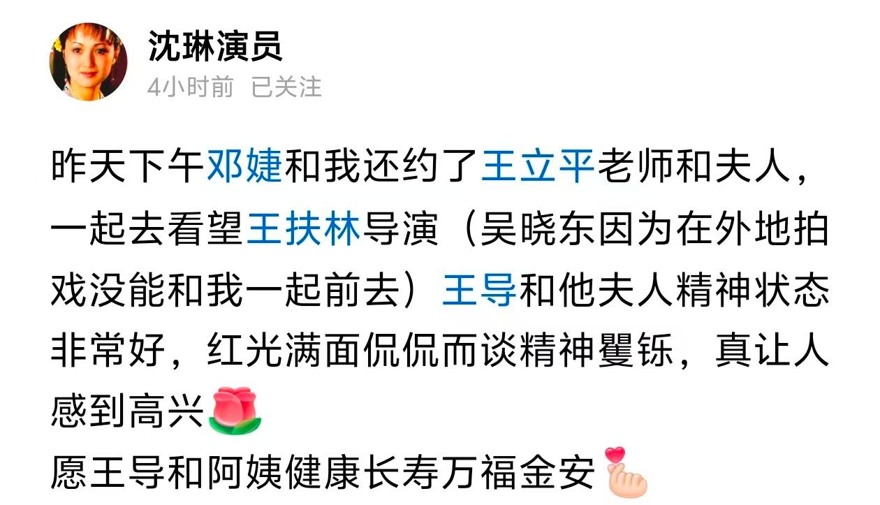 这两天“平儿”扮演者沈琳和“王熙凤”扮演者邓婕在社交媒体上发文,她俩和王立平夫妇相约一同去看望了王扶林。