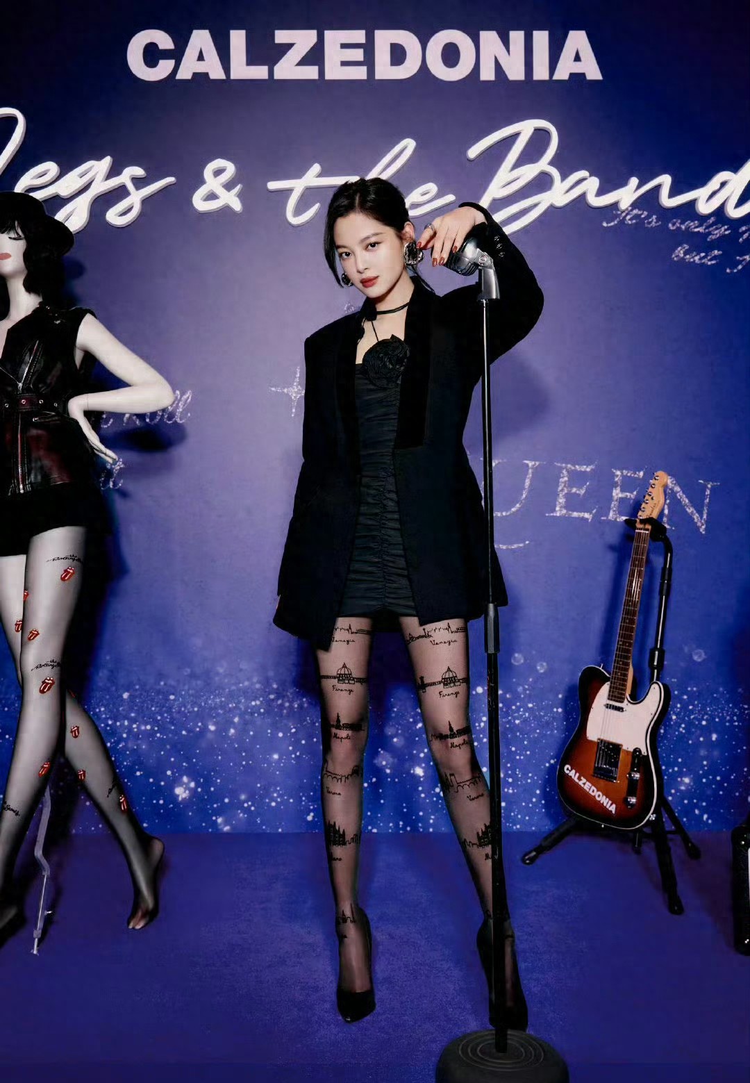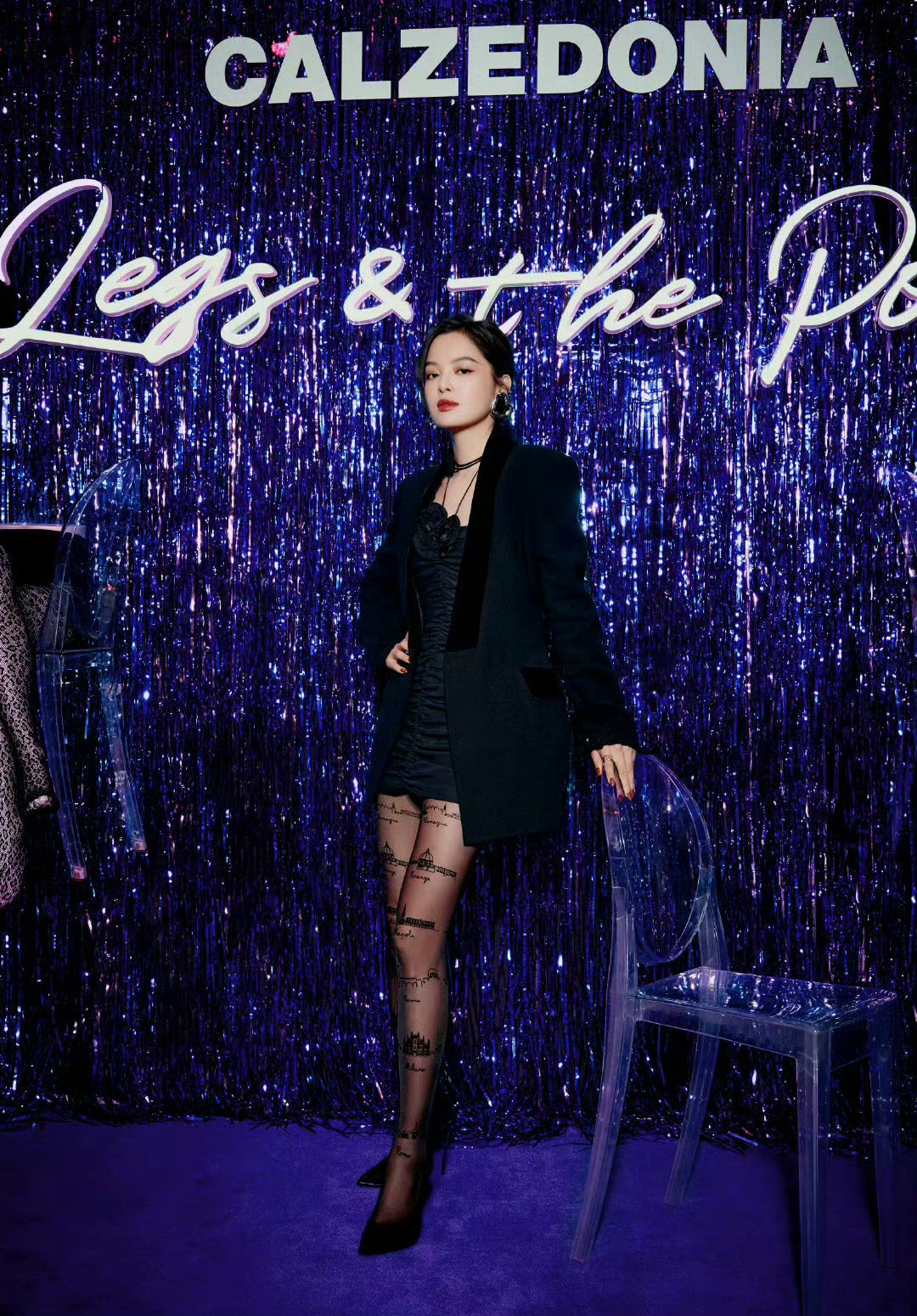 辛芷蕾腿上那双带有城市建筑纹样的黑色丝袜,轻薄材质若隐若现地勾勒出修长笔直的腿部线条,搭配黑色尖头高跟鞋,更将优越腿部比例衬得淋漓尽致。