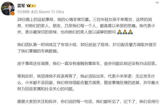 见此雷军也不得不回复了,在4月1日,雷军发消息表示对于此次事故他深感歉意,在此他向受害者的家人们表示深切的哀悼......,雷军说完对受害者家属的歉意后,就开始说明情况了。