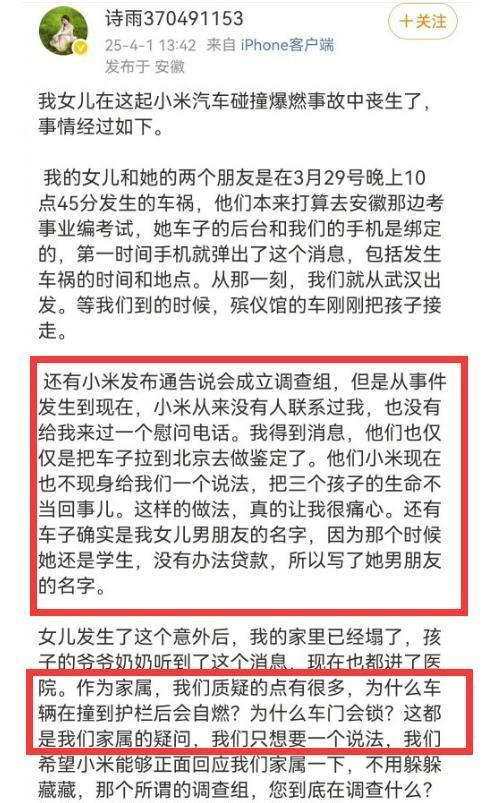 可逝者已逝,如今她们能做的就是搞清楚这起事故究竟是怎么回事,为什么在发生车祸后车自燃了,又为什么车门打不开?希望小米官方能够给他们一个合理的解释。