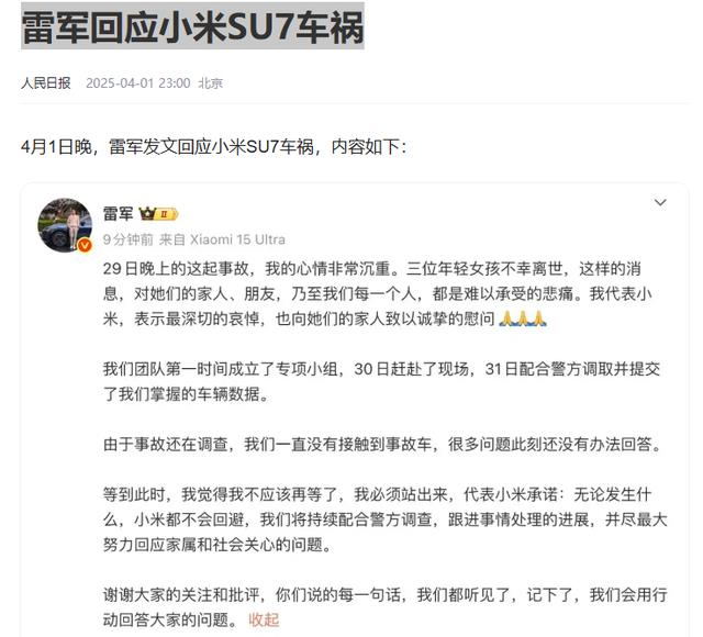人民日报 雷军回应小米SU7车祸2025-04-01