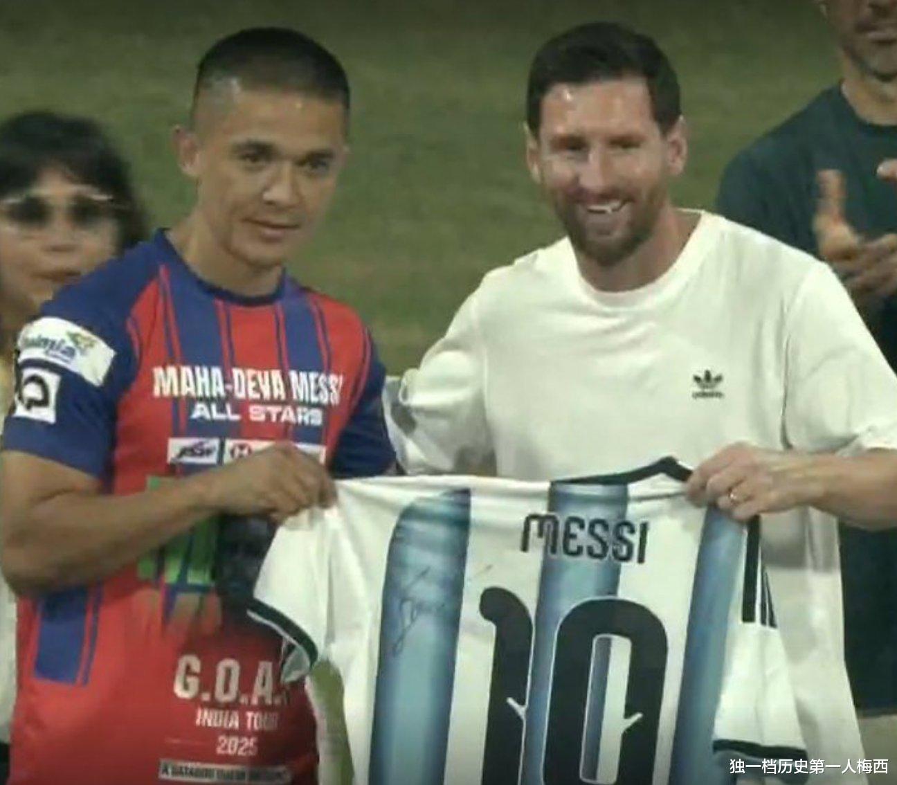 然而,在孟买布罗布朗体育场的现场,剧情发生了戏剧性的反转:切特里不仅现身,更身穿主办方制作的梅西10号GOAT球衣,还与梅西亲切握手、寒暄并合影。那位被描述为“抗拒”的印度名宿,用实际行动表达了对球王最直接的敬意,也让此前围绕他引起的针对梅西的争议性报道不攻自破。