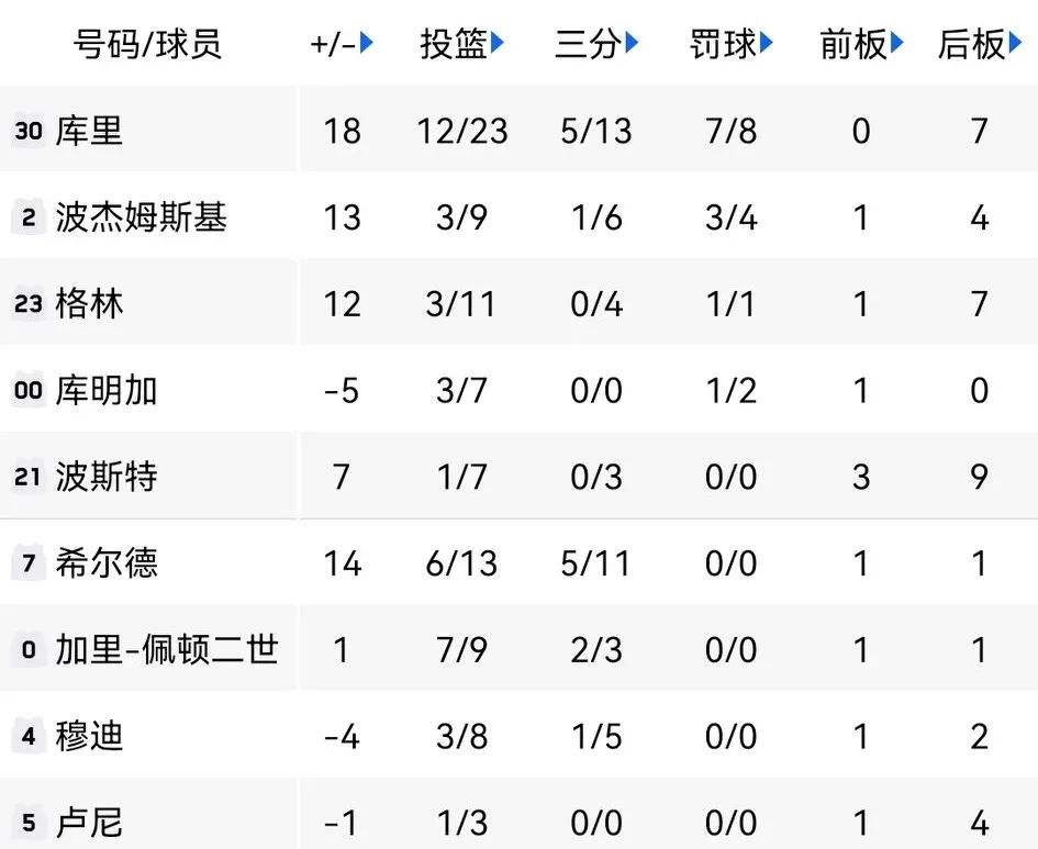 勇士队库里36分7板9助1断2帽,波杰10分5板,格林7分8板4助2断3帽,库明加7分,波斯特2分12板4助,希尔德17分3断,佩顿16分(末节5中5得到11分)。