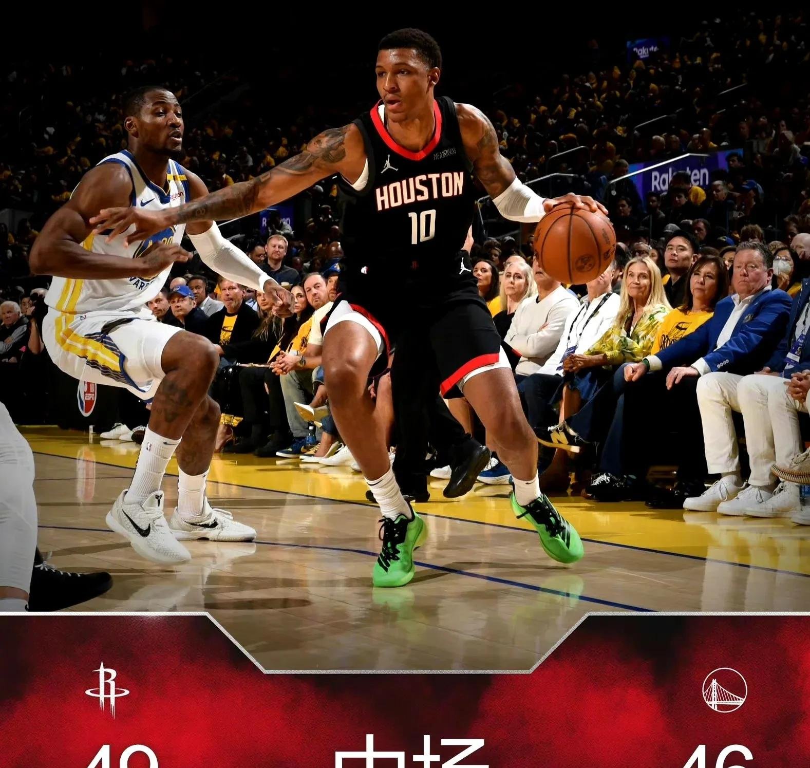 第二节史密斯三分不中,火箭连续前场篮板后亚当斯补篮命中,库里连续失误,火箭也连续进攻不中,狄龙吃到个人第3次犯规,申京勾手命中,佩顿命中三分,史密斯和申京连得5分,火箭31-21领先10分,库明加造伊森犯规两罚中一,阿门回应两罚中一,伊森中投得手打停勇士,暂停回来,波斯特勾手不中,伊森造犯规两罚中一,库里挑篮命中勇士本节第二个进球,亚当斯造犯规两罚不中,史密斯抢到前场篮板,阿门上篮得手,火箭37-24领先13分,库里命中个人本场第一记三分,史密斯跳投拿下两分,希尔德三分也有,亚当斯两罚全中,库里打板命中两分,狄龙飙进三分,格林上篮得手并造成狄龙第4次犯规,加罚命中后勇士35-44还落后9分,申京造波斯特犯规两罚不中,库里罚球拿下两分,阿门两分命中,杰伦格林抢断格林,伊森命中三分,库里和希尔德连得9分,勇士在中场时将比分追到46-49,库里单节7中4得到13分。