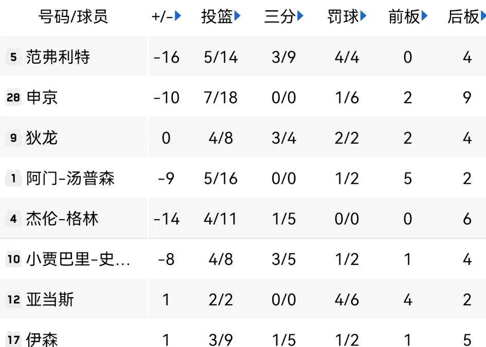 火箭队范弗利特17分4板3助(后三节4分),申京15分11板4助(18中7,罚球6中1),狄龙13分6板6犯规,格林9分6板5助(11中4),阿门11分7板4助(16中5),史密斯12分5板2帽,伊森8分6板2帽,亚当斯8分6板。
