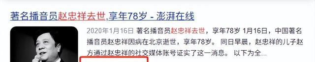 2020年1月16日,“央视第一男播音主持人”赵忠祥因病去世。