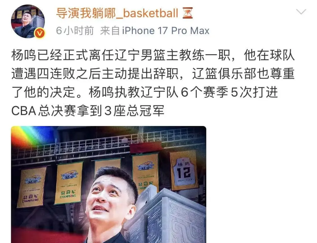 谁能想到杨鸣以这种方式告别辽宁队,辽宁知名媒体人@导演我躺哪 报道,杨鸣已经正式离任辽宁男篮主教练一职,助理教练乌戈接替球队主帅一职。据了解,本赛季球队战绩不佳,杨鸣一直都有请辞的想法,昨晚不敌新疆队是杨鸣主动下课的最后一条导火线。随后直播吧官方等多个体育平台也同步更新杨鸣下课的内容,就差辽宁队官宣。
