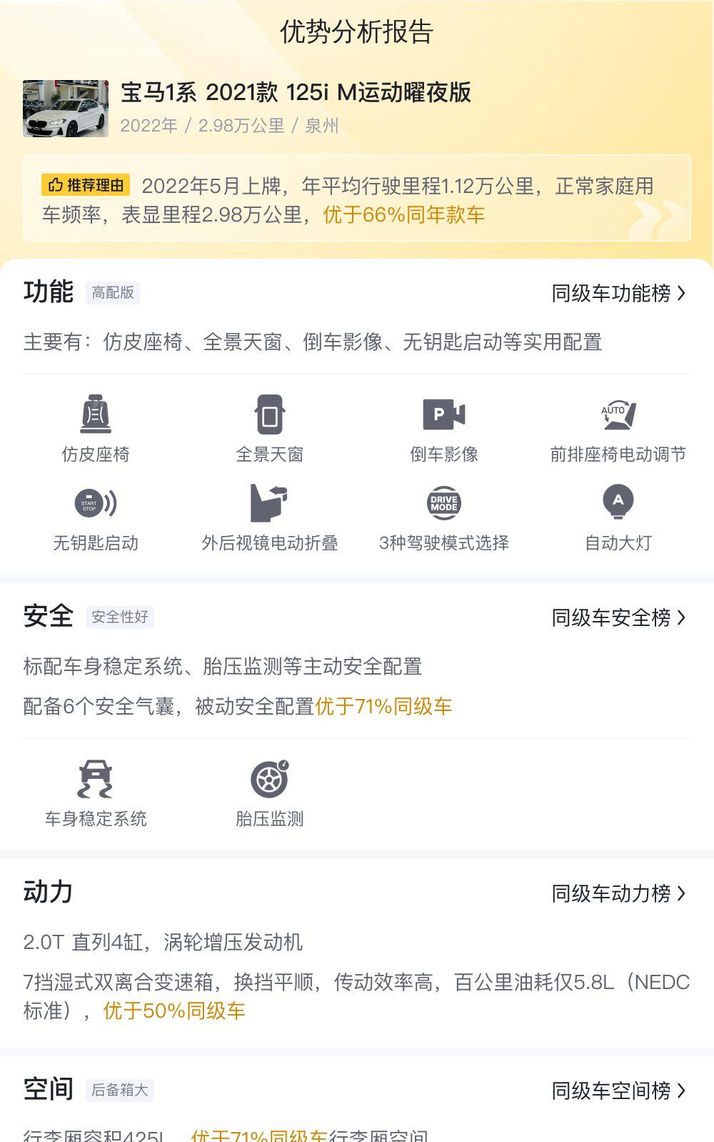 1. 车辆信息:2021款宝马1系 125i M运动曜夜版,2.98万公里,2022年5月上牌,白色,13.35万。