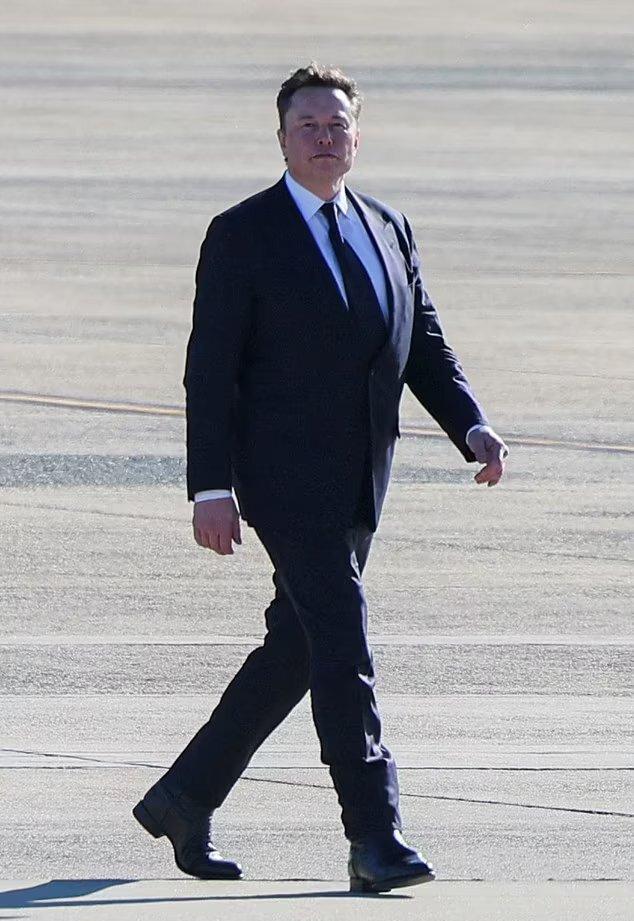 会议结束后,马斯克在保镖和助手的护送下离开。他身着西装,系着领带,昂首阔步。他穿着一双西部短皮靴,走起路来大步流星,高昂着头。
