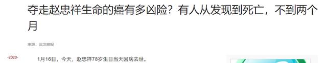 信息来源:环球网 2020年1月16日——夺走赵忠祥生命的癌有多凶险?有人从发现到死亡,不到两个月
