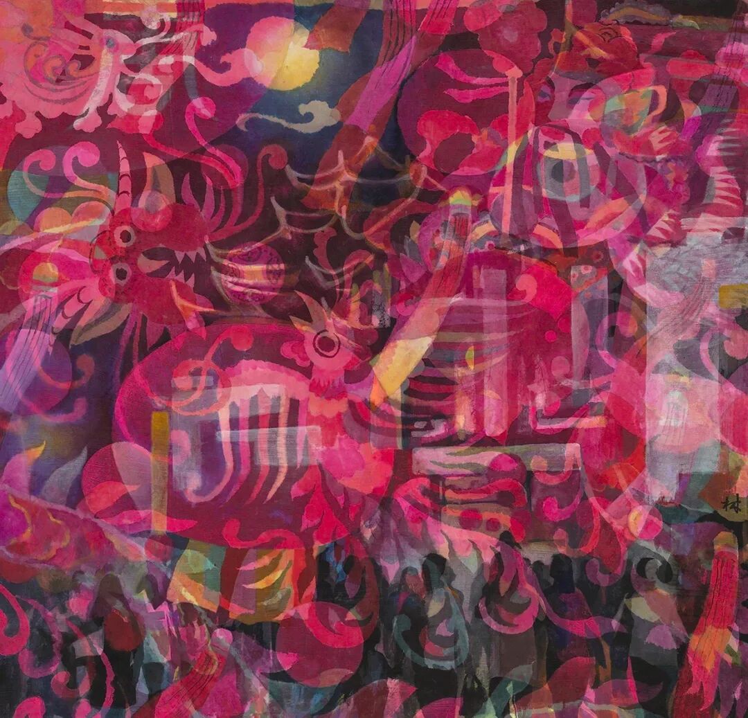 如何用视觉图像来综合表现这些特征尤其是前七个特征呢?这个难题困惑了我多年,直到我创造出帛画的色变效果后,于1996年的元宵节完成的《闹元宵》,才终于探索出表现中国年的方法,自此中国年卷系列成为我创作的重要内容。在中国年卷系列中,我把脑海里积累的各种形象择其典型,使用山西剪纸、贵州苗绣、汉代画像石与瓦当等多种中国民间造型手法作变形处理,再用分朱布白的构成方式将这些形象进行组合构图,用汉代马王堆帛画的写意重彩手法和现代的色彩构成原理,让和谐统一中的各个形象产生或隐或现、或远或近的变化,形成具有各自韵律节奏并能产生色变效果的作品。