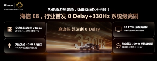 对于游戏玩家而言,海信E8Q Pro 的4K 170Hz原生高刷和330Hz动态刷新率,将单帧响应时间压缩至5.88ms,逼近人类神经反射的极限。在高速赛车游戏中,170Hz刷新率能清晰捕捉车身反光和轮胎烟雾的每一个细节,配合330Hz动态刷新率的插帧补偿,彻底消除画面拖影和撕裂。此外,全新的极光瞬影引擎实现了控光与画面的0延迟同步,让玩家体验“一触即发”的同步操作感。