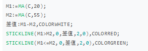STICKLINE(M1>M2,0,差值,2,0),COLORRED;:当M1大于M2时,从0开始绘制一个宽度为2的色带,色带的高度等于差值,颜色为红色。