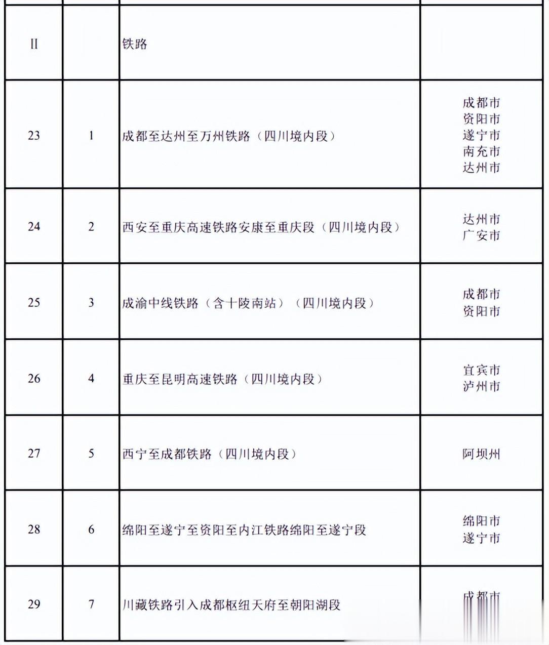 铁路新开工项目包括4项,分别是:绵阳至遂宁至资阳至内江铁路遂宁至内江段、新建南充至广安铁路、宝成铁路(成都局管段)改造工程和宝成铁路改造及新建青白江至金堂线。