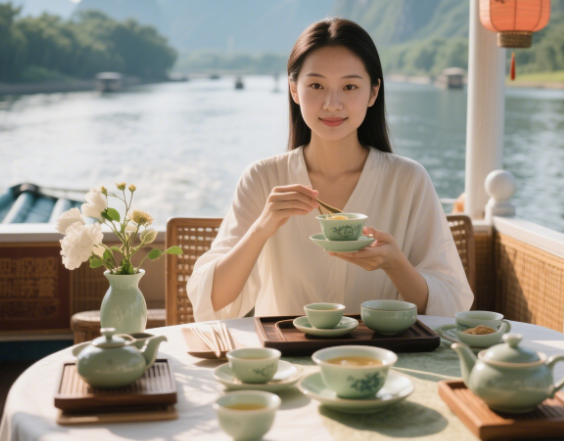 为了让游客更好地领略茶文化的魅力,游船特别安排了专业的茶艺师现场表演。你瞧,茶艺师手法娴熟,优雅地展示着泡茶的每一个步骤:温杯、投茶、注水、出汤…… 一系列动作行云流水,让人不禁为之赞叹。在这过程中,茶艺师还会耐心地讲解每一种茶的特点、功效以及冲泡方法,让游客不仅能品尝到美味的茶汤,还能学到丰富的茶文化知识。想象一下,游船缓缓前行,窗外是如诗如画的漓江山水,而你坐在舒适的船舱内,品着一杯香气四溢的热茶,听着茶艺师娓娓道来的茶文化故事,这是一种多么美妙而惬意的体验啊!