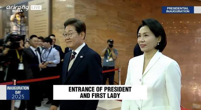 李在明和夫人金惠京走入韩国国会大楼,参加总统就职仪式