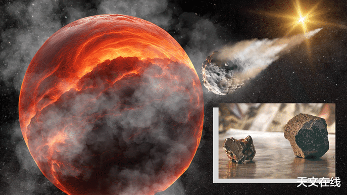 主要:插图显示,以太阳为背景,一颗小行星向熔融的原始地球飞驰而去。插图:一颗铁陨石来自熔化的小行星(左)的核心,一颗球粒陨石来自一个“原始的”未熔化的小行星(右)。