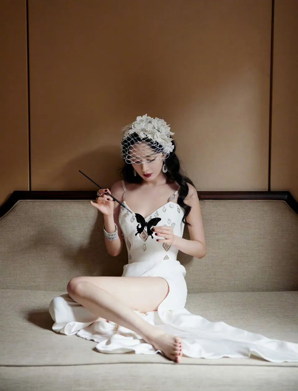 杨幂身穿吊带深V长裙的杨幂,性感锁骨和一字肩清晰可见,皮肤依然白皙紧致,一点不像是生了孩子的人。