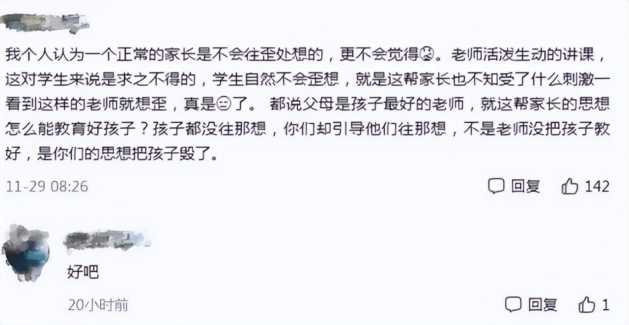 言论自由,观点各异面对家长们的担忧和争议,网友们也是各抒己见。有些网友很支持家长的想法,他们认为年轻老师应该更加注重自己的身份和职责,不要做出太过格的行为。