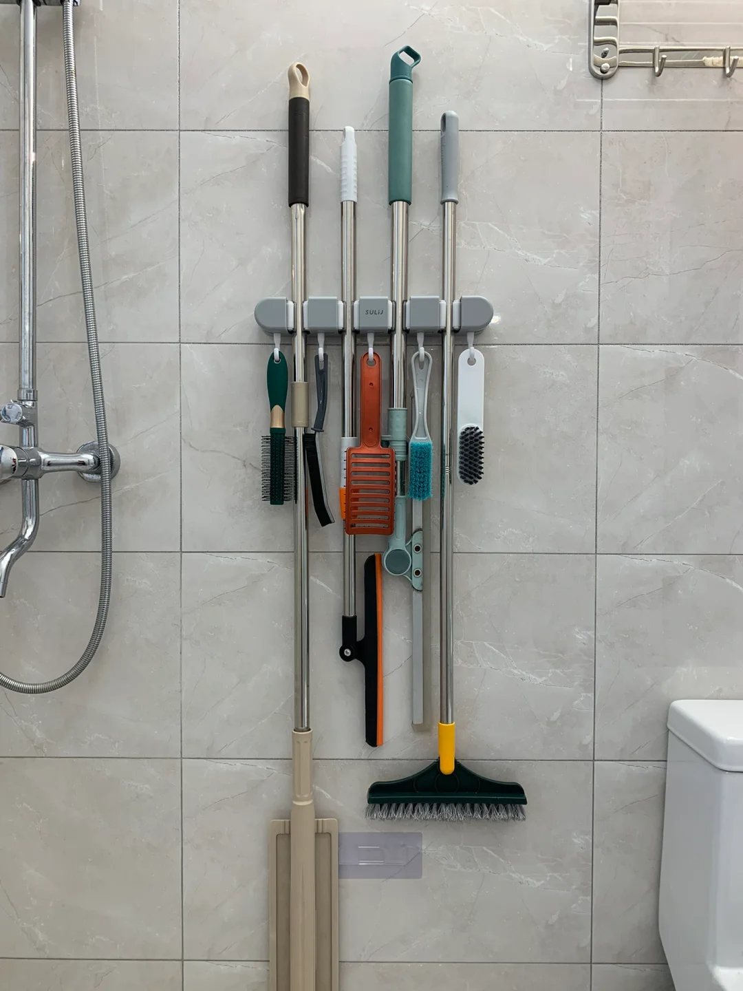 还有一个简单的办法,就是直接在卫生间安装夹子,让所有的清洁工具全部上墙,不仅节省了地面的空间,而且看起来也非常整齐。