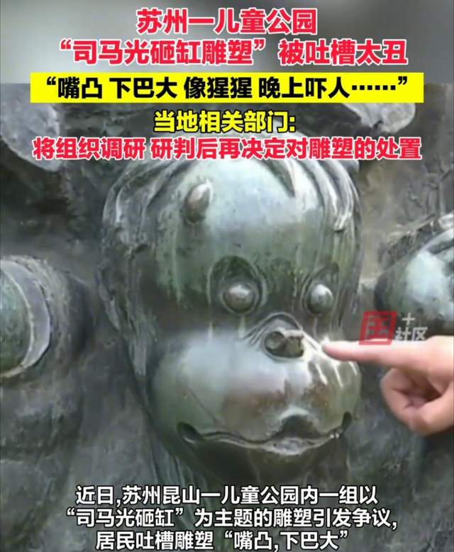 市民直呼"辣眼睛"这座"司马光砸缸"雕塑位于昆山市某儿童公园内,主题取自中国古代经典故事——司马光幼时砸缸救人的典故。然而,雕塑中的人物形象却让不少市民感到不适。