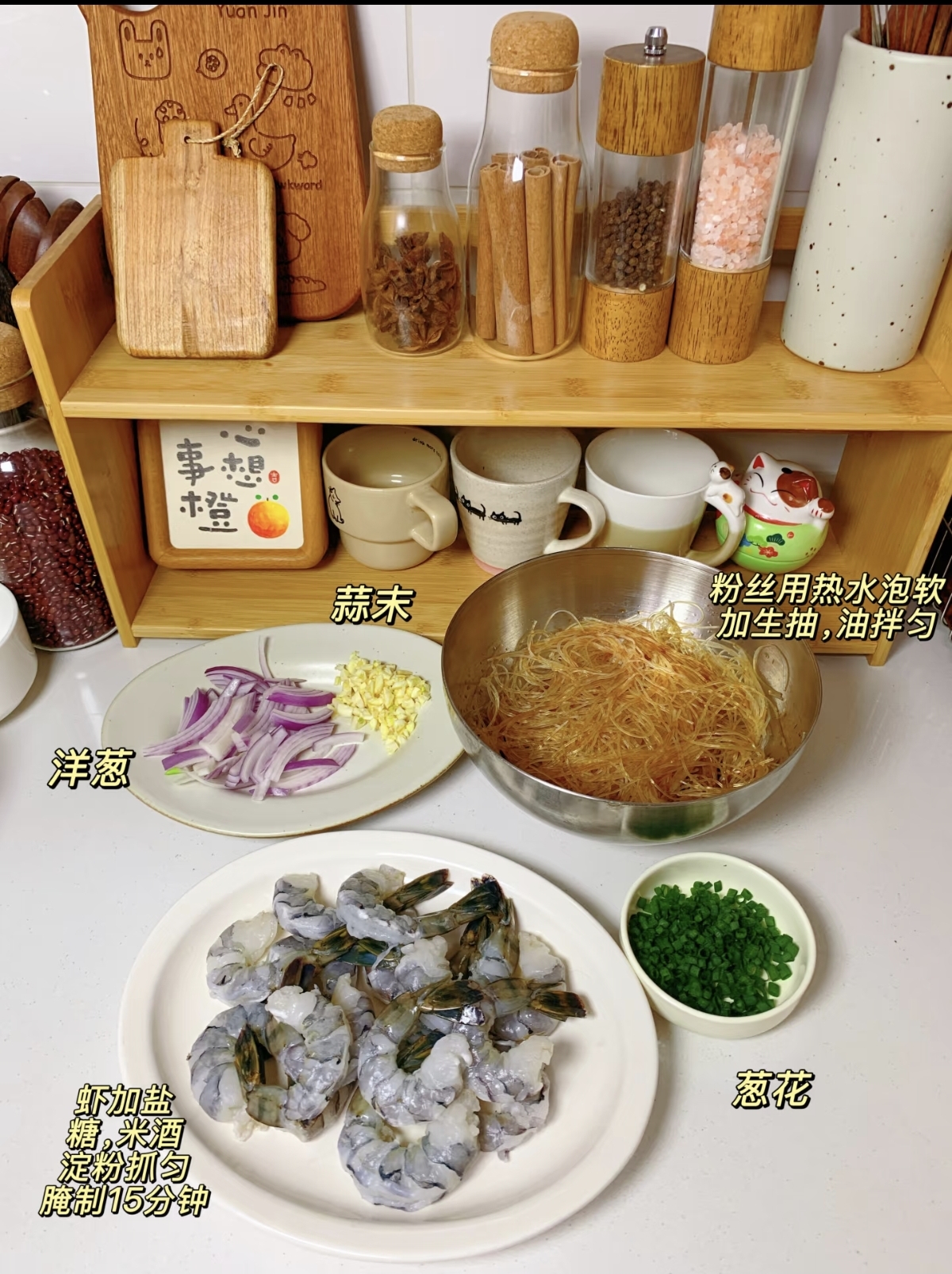 先别急着动手,咱们先把食材准备好,这可是成功的第一步。你需要买上一斤左右的新鲜基围虾,个头别太小,不然剥起来太费劲。粉丝是这道菜的灵魂伴侣,来一把龙口粉丝就行,记得提前用温水泡软,大概泡个十分钟左右,让它变得柔顺听话。然后就是重头戏——大蒜!多准备几头大蒜,毕竟“吃肉不吃蒜,香味少一半”,咱们要做的是灵魂蒜蓉,所以蒜量要足。再来点小葱切成葱花,如果有条件,放点小米辣圈进去,颜色好看,吃起来还带点小刺激,那味道简直绝了。最后就是调料,生抽、蚝油、白糖和食用油,家里厨房常备的这些就足够了。