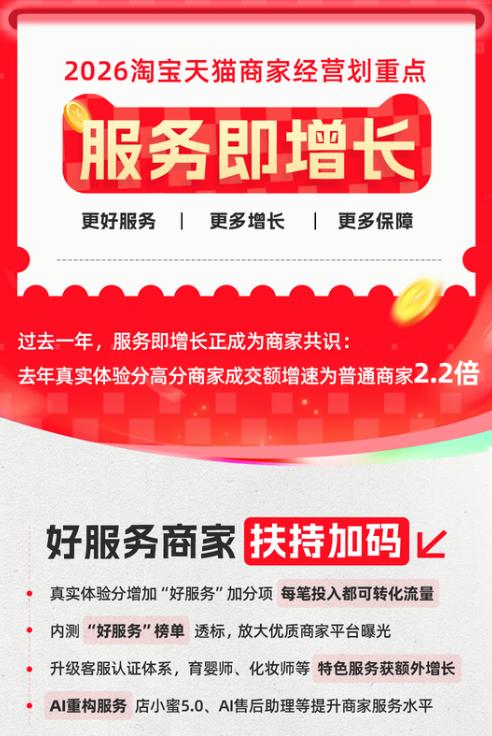 服务即增长,消费者和商家离不开平台的连接与指引。1月20日,淘宝天猫在商家服务大会上宣布,平台将在2026年帮助数百万优质商家做好服务,包括四大举措:第一,升级真实体验分加分体系,进一步明确服务增长路径;第二,内测“好服务”榜单,为好服务商家增加曝光;第三,升级商家客服认证体系,让专业好客服获得专属透标和择优分配;第四,加大AI投入,以AI重构服务。