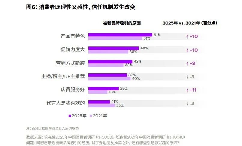 埃森哲发布的《美好生活新主张——中国消费者洞察》报告显示,虽然总是多元且矛盾,但消费者十分清楚自己想要什么——无论是功能性需求还是情感性需求,并暗自标记了愿意为此支付的价格。更为有趣的是,对比2025年和2021年的数据会发现,店员服务吸引消费者尝试新品牌的影响力在明显增强,11个百分点的提升,在所有影响因素中名列前茅。