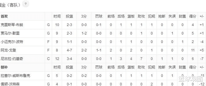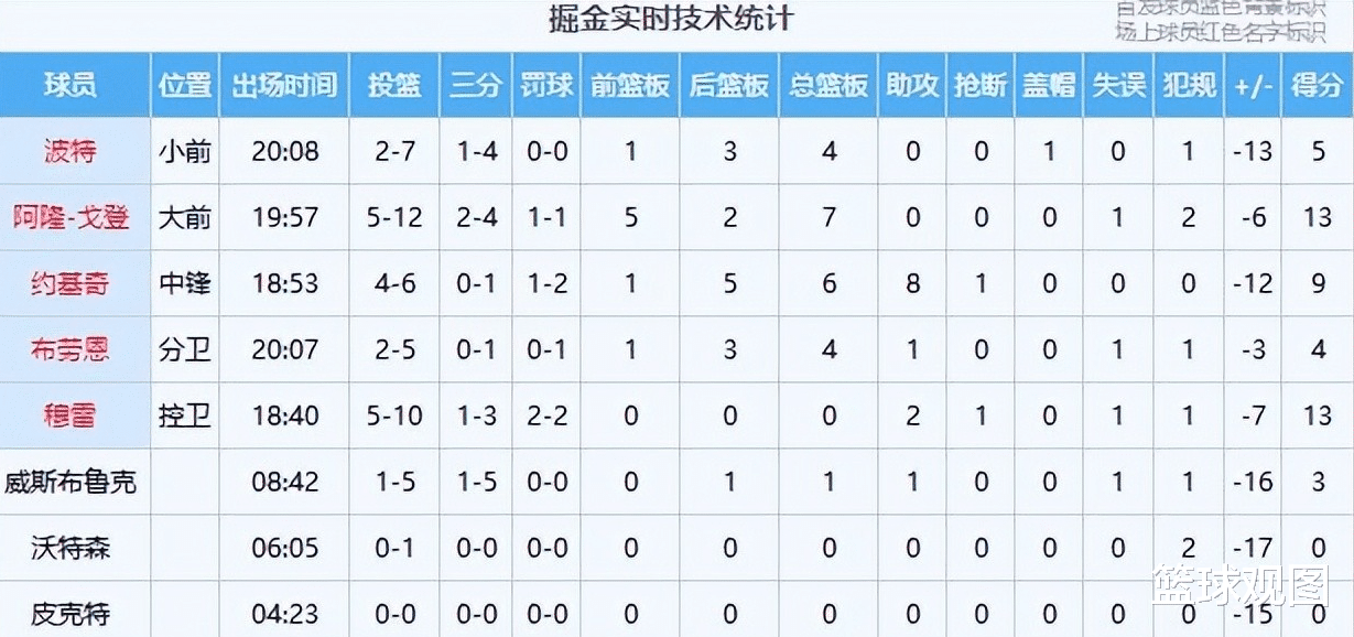 约基奇23分13板13助、穆雷23分4助、阿隆-戈登15分7板、布劳恩9分6板1助、波特7分6板1助、威斯布鲁克3分1板1助、沃特森2分2板、纳吉1分1板、斯特劳瑟1板、小乔丹1板