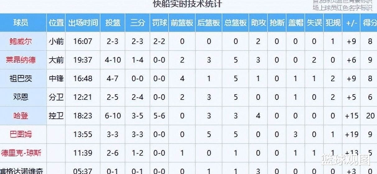 莱昂纳德21分11板6助、哈登20分6板9助、鲍威尔20分1板3助、祖巴茨19分9板1助、巴图姆12分5板2助3帽、德里克-琼斯10分1板2帽、邓恩6分8板、尤班克斯3分、米尔斯3分、博格达诺维奇2分1板3助