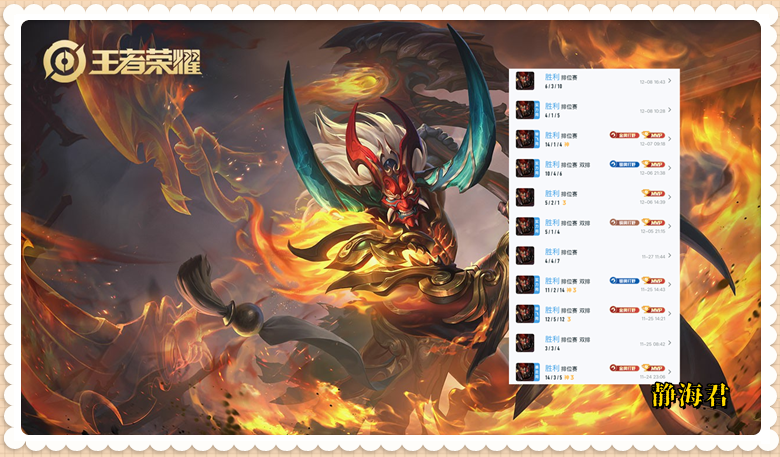 如果说典韦是我的基本盘的话,那「哪吒」就是我能快速上分的助推器,虽然我用他胜率不是很高,但是新版哪吒确实让我在典韦之外有了一个稳定的上分点。