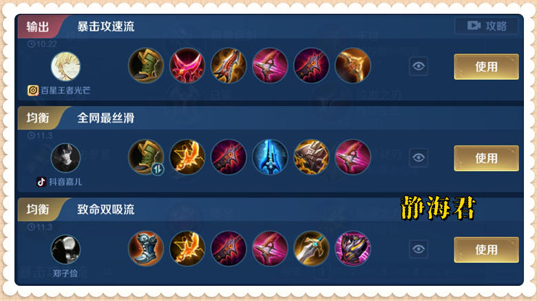 如果你对自己的操作有信心,可以选择攻速暴击流:影忍之足、影刃、无尽战刃、破晓、末世和逐日之弓。