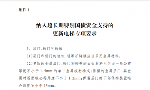 有业内专家透露,之所以出现这样的情况,是由于按照通知要求,纳入国补资金支持的更新电梯项目,自6月11日当天起,必须严格遵循新的检验要求。这一新规对电梯部件的要求有了大幅提升:例如层门和轿门的地坎、轿厢护脚板应当采用金属材料;更新的金属层门、轿门和轿壁的面板材料至少由一层公称厚度不小于1.5mm的单一金属板材构成;对于额定载重量大于630kg的电梯,其轿厢侧导轨宽度b1应当不小于89mm;悬挂钢丝绳使用年限不少于10年或者对应电梯驱动主机启动次数不少于200万次等。