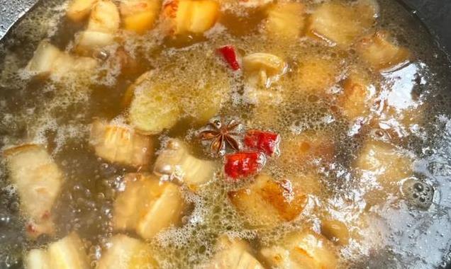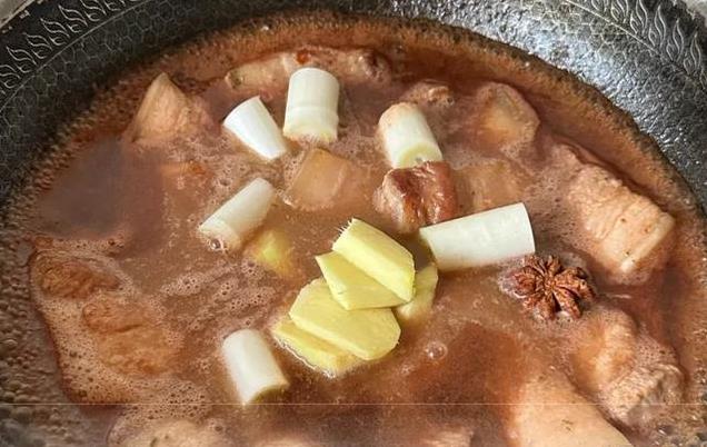6. 倒入适量清水,没过五花肉,大火烧开后转小火焖煮约 30 分钟。