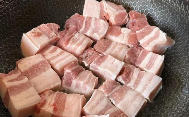 1. 五花肉洗净切块,冷水下锅,加入料酒和姜片,焯水去腥,捞出沥干水分。