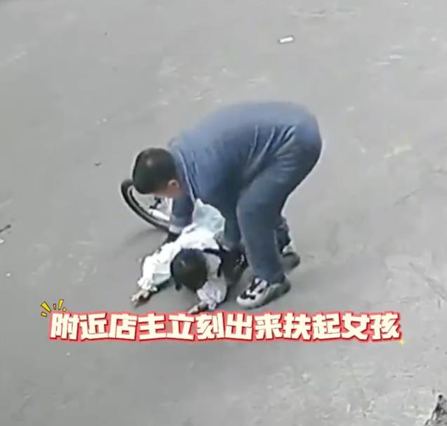 女孩倒地后哇哇大哭,店老板听到哭声后急匆匆走出来,上去将小女孩搀扶起来。