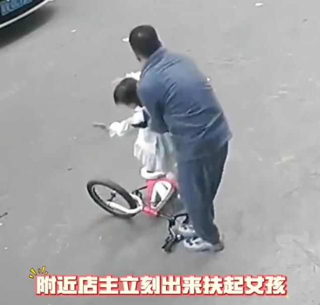 店里的老板娘闻声也出来了,扶起自行车跟着小女孩,打算把自行车给她送回去。