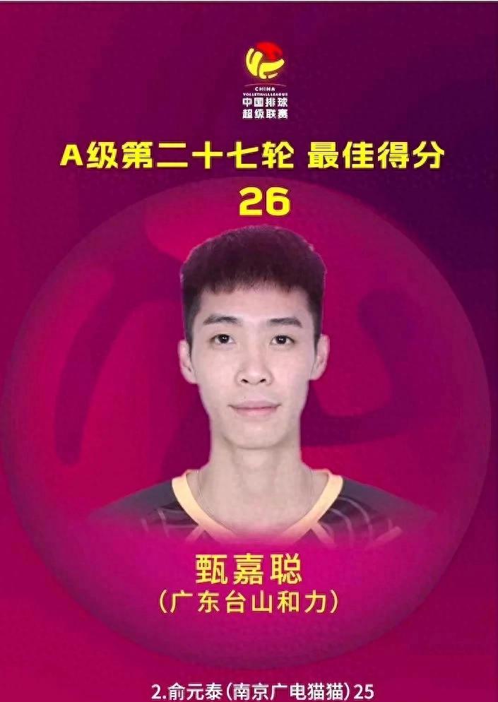 排球比赛里面总有那么几个人特别厉害,这不,甄嘉聪就是个很能打的选手,他一个人就拿了26分,扣球一传都玩得溜,让人看得眼花缭乱,跟着场上节奏都忍不住想跳起来。