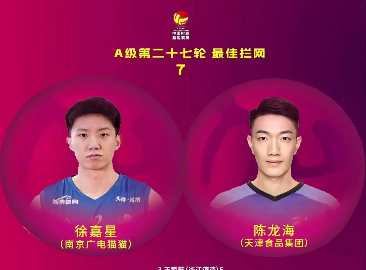 南京广电猫猫的徐嘉星和天津食品集团的陈龙海,这俩人在拦网上是真有两下子,都是7次成功,这数据放在联赛里面也是相当不错了。