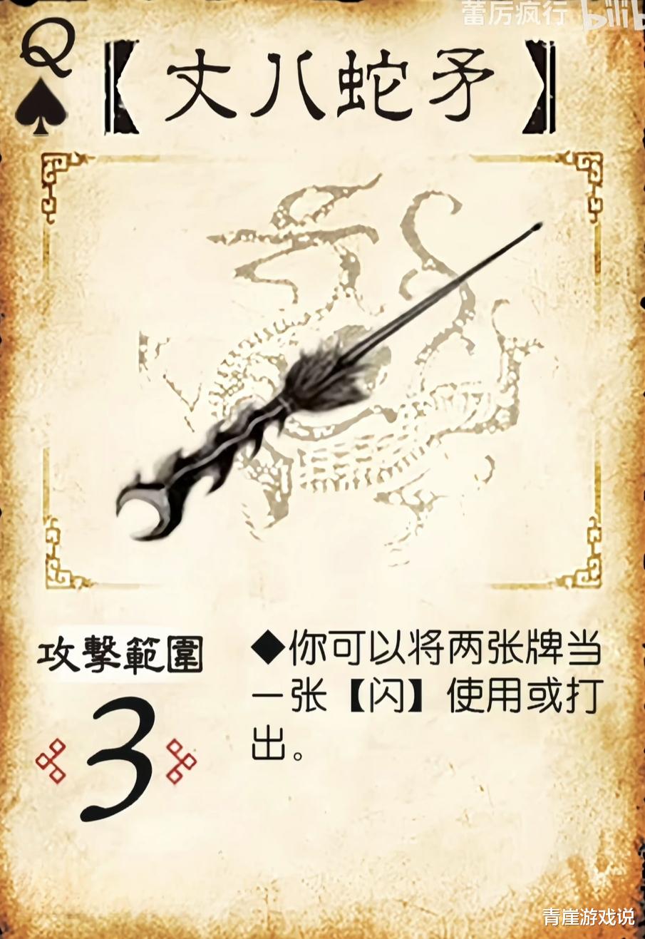 丈八蛇矛的防御效果是拿两张牌当成闪。毫无疑问的强力防御技能,比贯石斧多了更多灵活性。同样是两张牌防御,丈八蛇矛和贯石斧的效果稍微重叠,他们同样是一等一的防御武器!