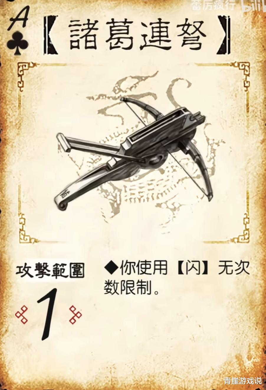 诸葛连弩的防御效果是无次数限制出闪,好家伙,大家都知道出闪本来就没有次数限制的设定。诸葛连弩拥有这个防御技能,就单纯等于脱裤子放屁,毫无作用!