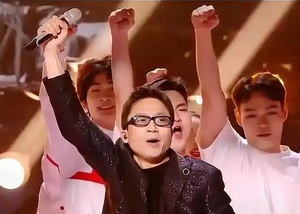 拿着话筒的他在舞台上又唱又跳,像是一直活泼灵动的年轻人,,他脚下不停地踩着姐姐拍,唱得十分投入。