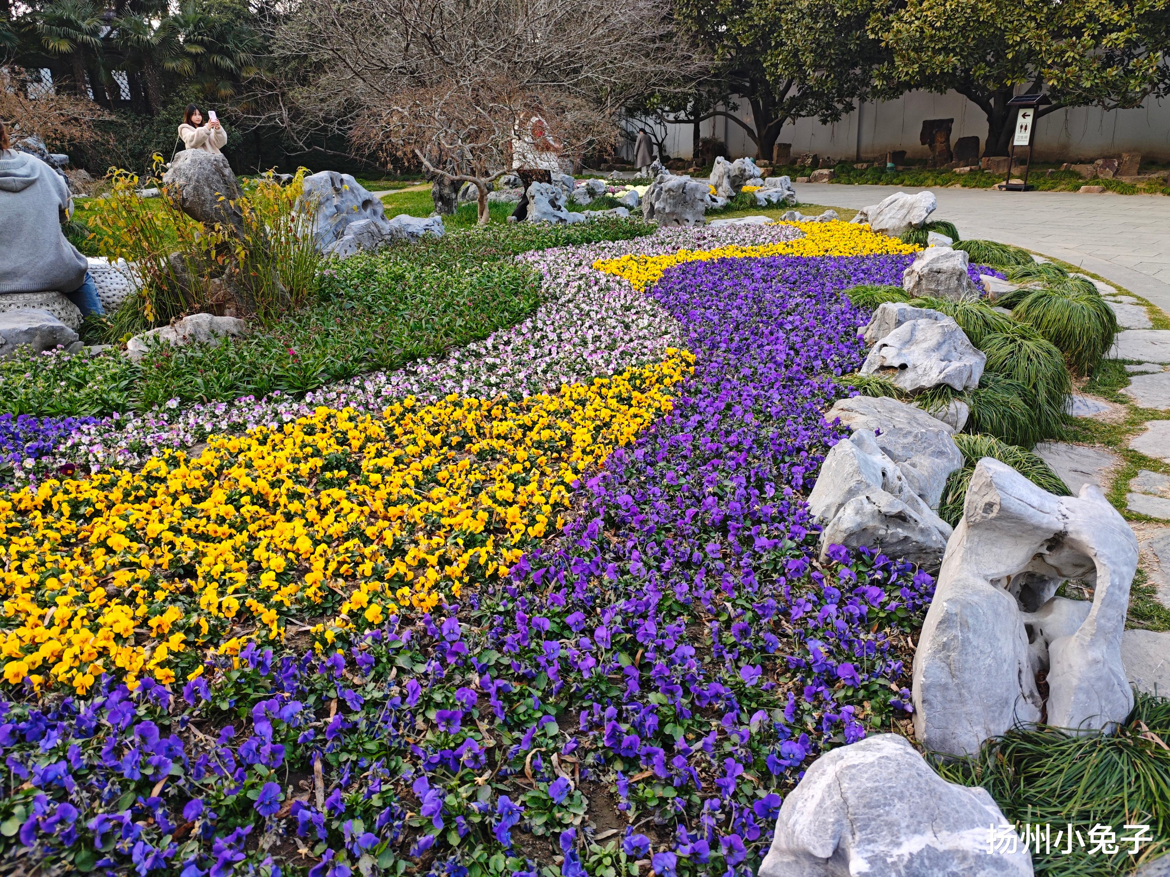 继续往前走,走到桃花坞。这里的春天,美得像仙境。徐园左侧这一块方寸之地,有玲珑的太湖石,有大片的桃花林,还有地面上的三色堇、矮牵牛等组成的优美图形。图形有着清晰的流线型线条,蜿蜒柔和。