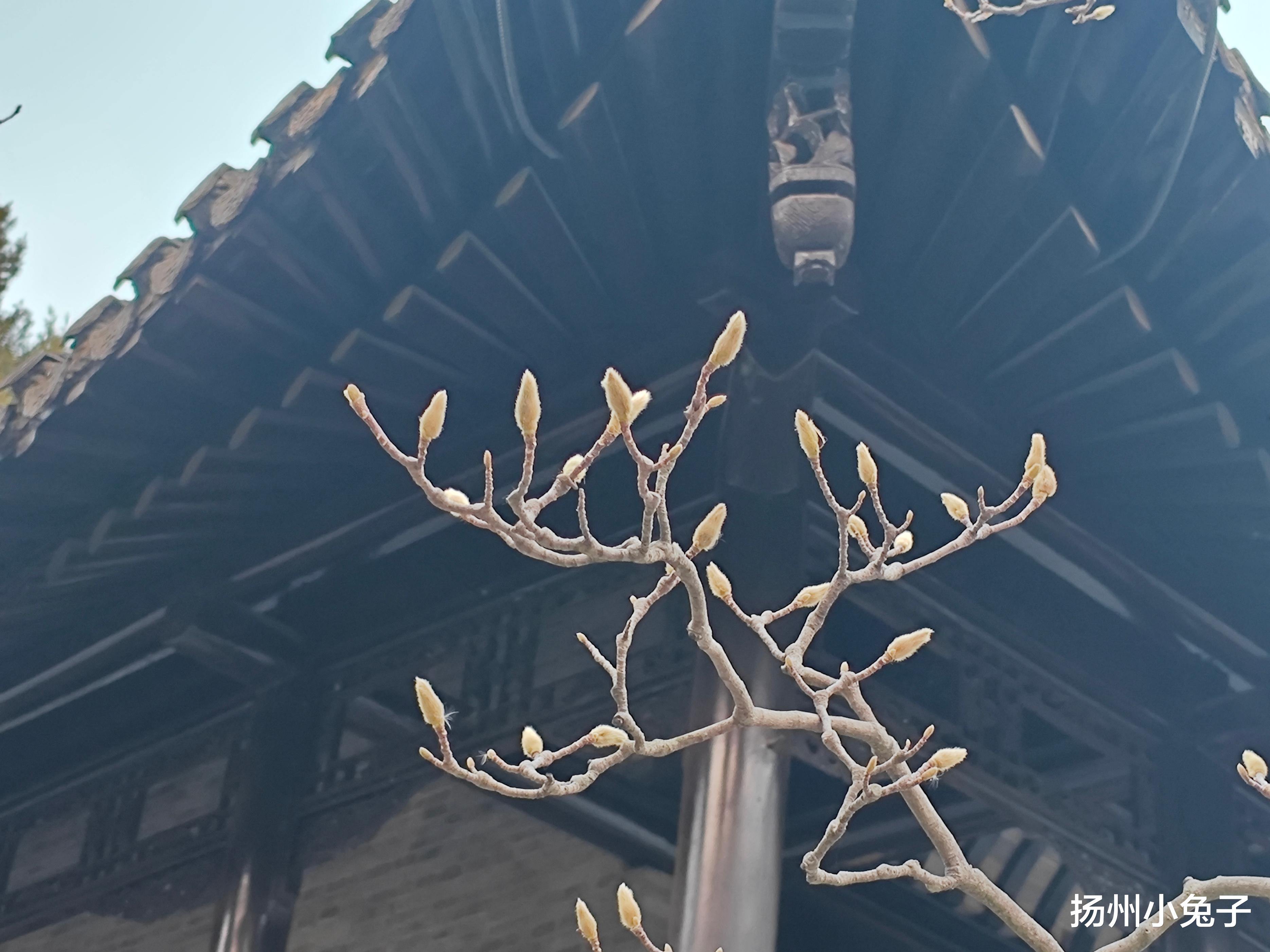 过小红桥,从小金山右侧走向梅岭春深。茶室拐角,一小片红梅吐露风华。前面看到不少红梅,只有绒花般的红色小珠珠。这里的每一棵梅花,都在着急地开放。原来,瘦西湖寒冬里最美的春“色”,在这里。