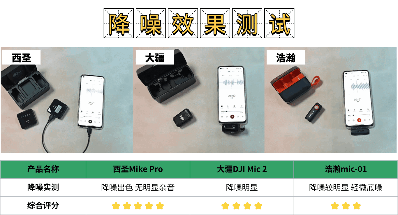 以上就是这三款无线麦克风的测评结果,整体来说这三款无线麦克风的表现都还算比较不错的,大疆的功能会更丰富,支持本地收音;浩瀚的外观颜值很高,而且支持快拍功能;而西圣麦克风在收音体验以及性能方面的表现都非常出色,远超同价位竞品,性价比非常高!总之,大家可以根据自己的具体需求,选择最适合的无线麦克风!