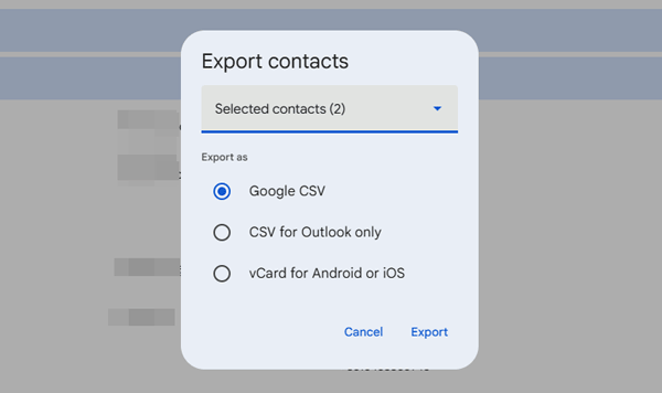 步骤 6. 选择导出文件的格式;例如,为了兼容性,请选择“Google CSV”。点击“导出”,联系人将保存为 CSV 文件。